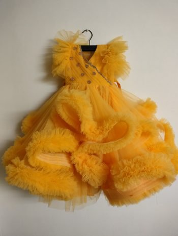 A dreamy gown with heavy frills and intricate embroidery work on the top. Soft, flowy, and sunshine-bright – perfect for a little princess!