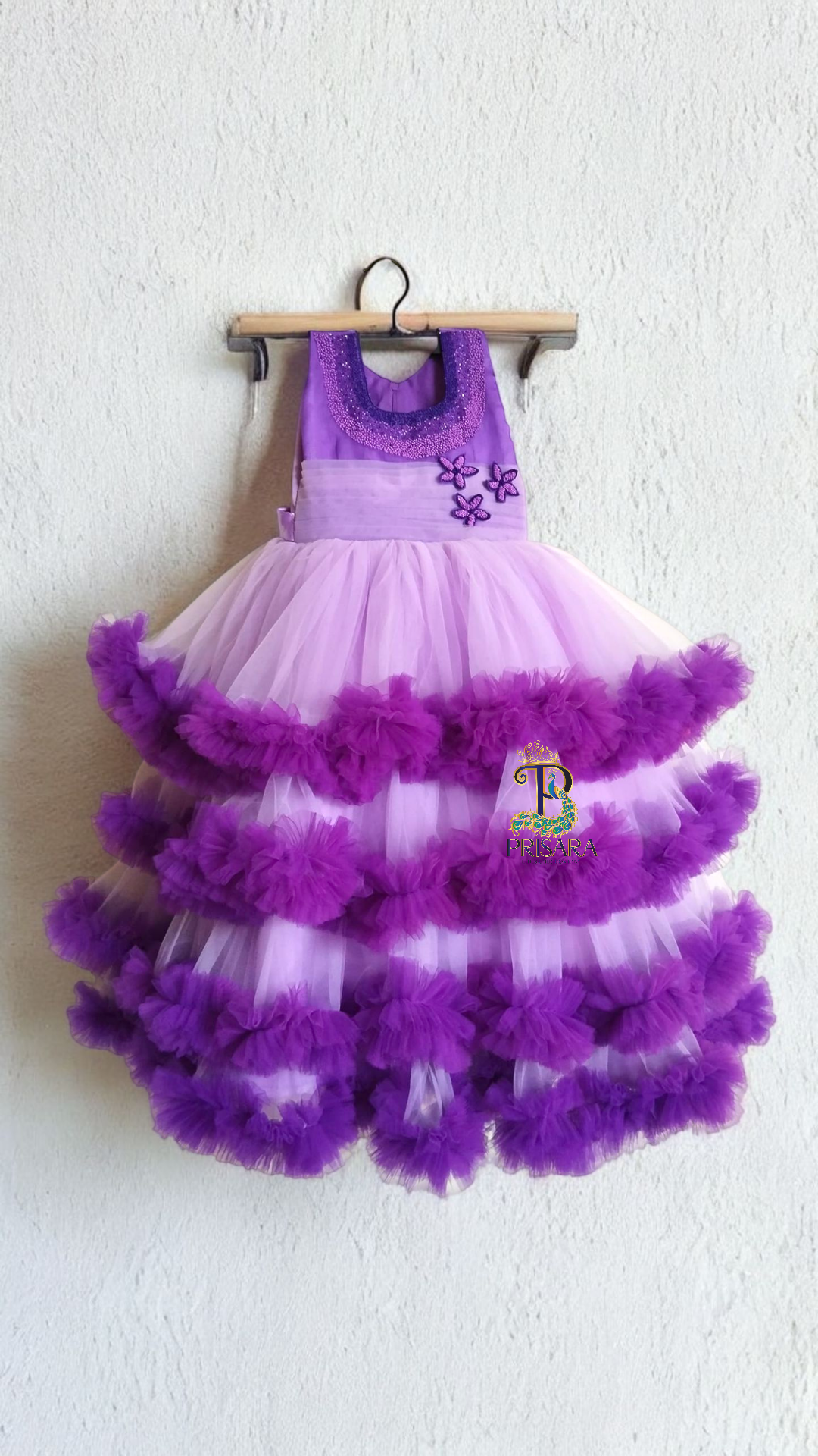 A head-turner with four rich frill layers, combining light and dark lavender hues. The neckline is decorated with 3 layers of heavy beadwork and premium 3D flower appliqué.
