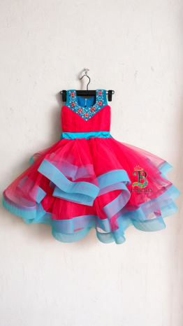 A playful and vibrant piece with a contrasting blue border, layered frills, and fine bead & thread work that adds texture and sparkle.