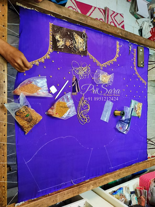 Aari embroidery “A Golden Touch: Aari Work Blouse Design Tutorial” By Prisara@321123 0 Comments Posted on February 14, 2025 Are you a fan of intricate aari work? If so, you’re in for a treat! In this blog post, we’ll delve into the creation of a stunning back hooks blouse with leaf neck featuring complete golden aari work. This design was crafted for a boutique owner who regularly entrusts me with bringing her aari work visions to life.The Design ConceptThe client’s vision was clear – a back hooks blouse with a leaf neck design, mirroring the elegance of her saree. The twist? She wanted the entire design to be adorned in radiant golden hues. To achieve this, I utilized a combination of golden zardosi, cut beads, sugar beads, idle beads, and kundan stones.Designing Process: A Step-by-Step Guide1. Stencil Creation:To simplify the tracing process for beginners, I created a stencil with 2-3 motives. The video accompanying this post demonstrates how to use the stencil effectively.. Tracing Technique:Starting from the center, I traced the design on one side, adjusting the stencil gradually to match the shape of the neck. Repeat the process on the other side to ensure symmetry.Aari Embroidery Classes:Sharing this technique is just a glimpse into what we teach in our aari embroidery classes. For more in-depth learning and various tracing and designing techniques, consider joining our classes. Visit www.prisara.com/classes for details.4. Execution:Once the tracing is complete, the real artistry begins. Starting with the outline, each motive is meticulously worked on. Despite the seeming simplicity, every detail demands time and precision.Join Our Aari Embroidery ClassesInterested in mastering the art of aari embroidery? Our classes provide a comprehensive learning experience, covering various techniques beyond just tracing. Visit www.prisara.com/classes for more information or call us at 8951212424 with any queries.Embark on your journey to creating exquisite aari work – one stitch at a time. Happy embroidering!To watch full tutorial video in English check below link To watch full tutorial video in Tamil check below link To watch full tutorial video in Kannada check below link Tracing paper Share:
