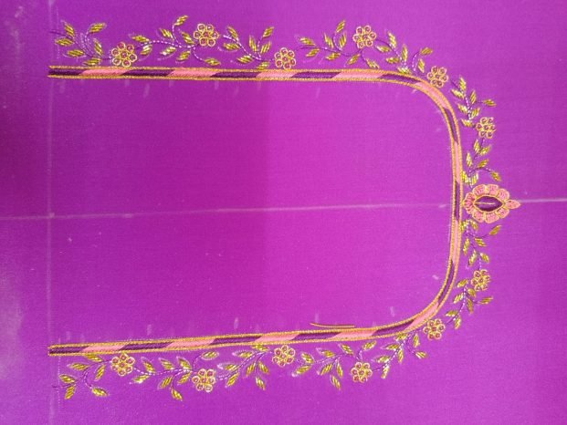 The blouse features intricate flower and kodi (vine) designs around the neckline, detailed with: