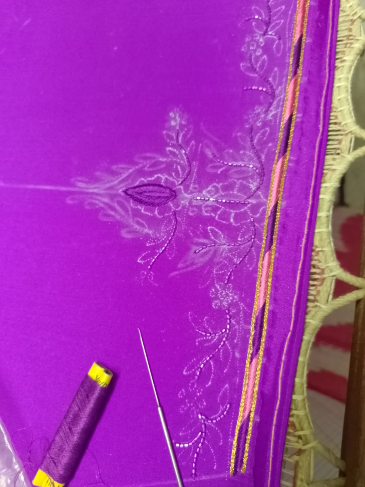 Every element was meticulously hand-done by our artisans, adding both grace and shine to the outfit. We also stitched the blouse perfectly to her measurements, which she shared conveniently over WhatsApp.