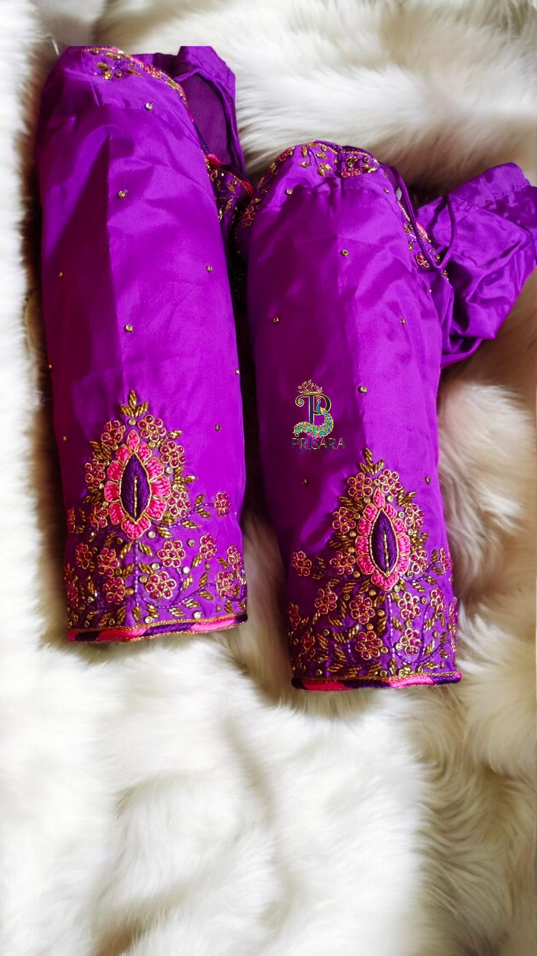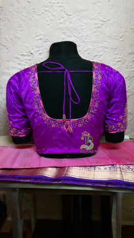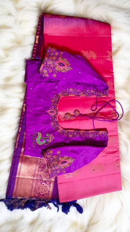 Instead of using the attached blouse piece that comes with the saree, our client requested that the blouse work be done on a separate semi-pattu silk fabric. This not only preserved the original saree but also allowed more flexibility in the design and stitching.