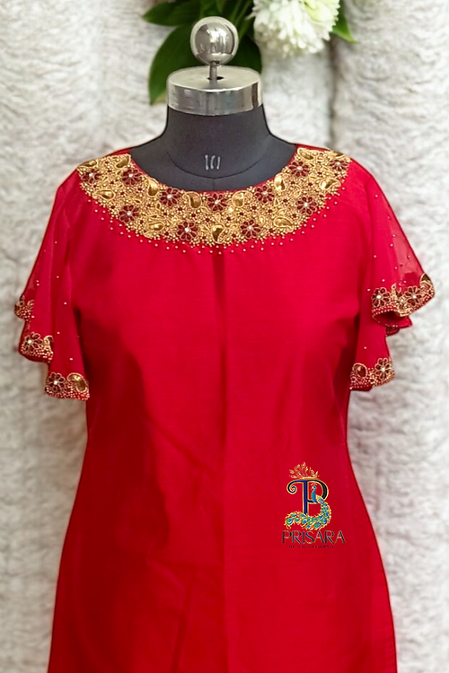 Elevate your wardrobe with this exquisite ruffle sleeves designer kurti in a stunning red hue, designed to blend elegance and style. Crafted with semi raw silk fabric and a comfortable cotton lining, this kurti is a perfect choice for various occasions.