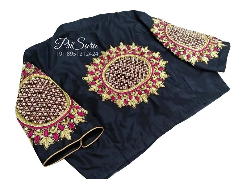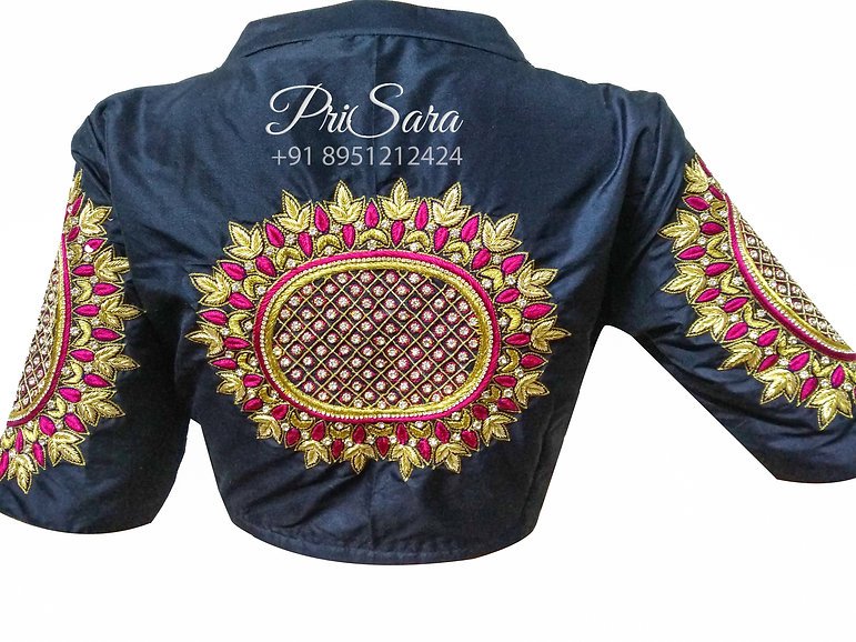 This is a black collar neck blouse, fully stitched. The design on the blouse is done using Zardosi embroidery, Threadworks, and Zircon stonework which puts this blouse in a unique and distinct design in today’s date. The blouse has elbow length sleeve with a heavy design same as the one on the back.