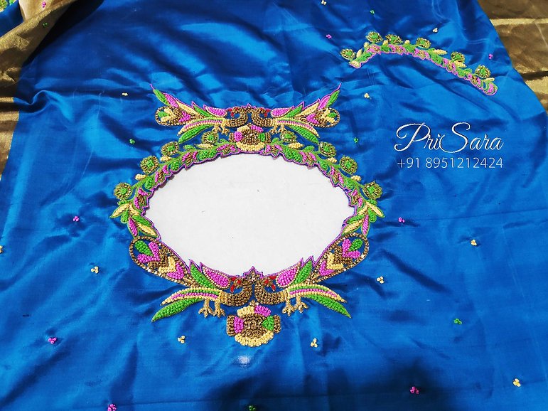 This is a Boat neck-designed blouse piece, unstitched. Heavy knotwork can be seen on the blouse piece, the embroidery is beautifully done in a round shape that shows a circle with birds, and leaves.