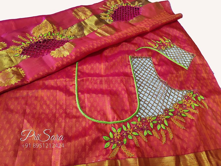 This is a cut-work design blouse, unstitched. The cut-work can be seen on one side of the blouse when fully stitched.