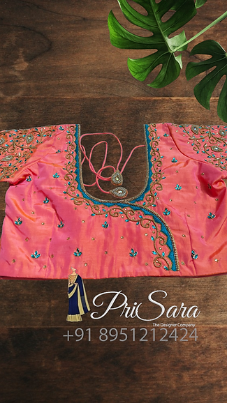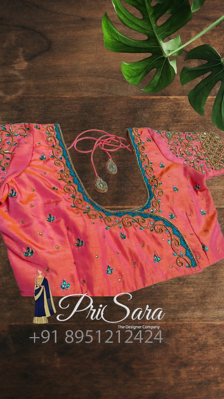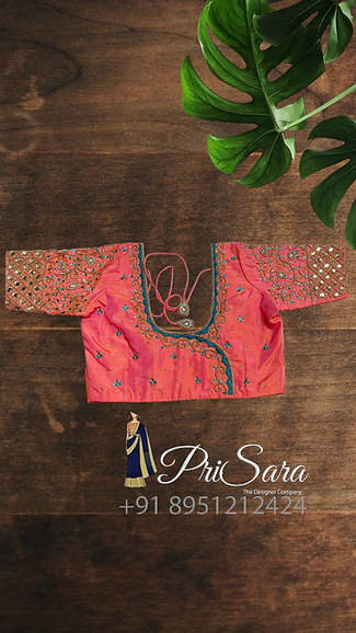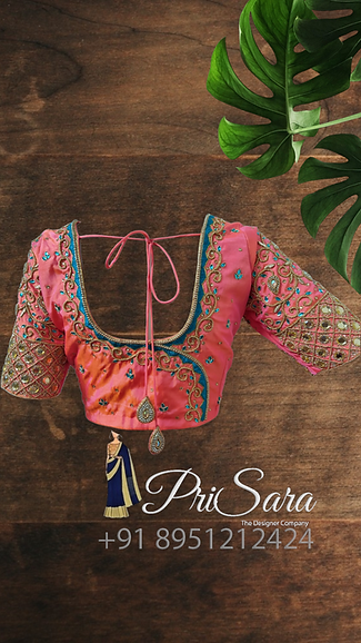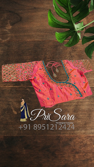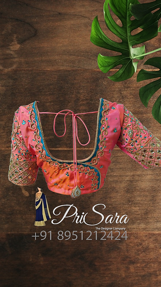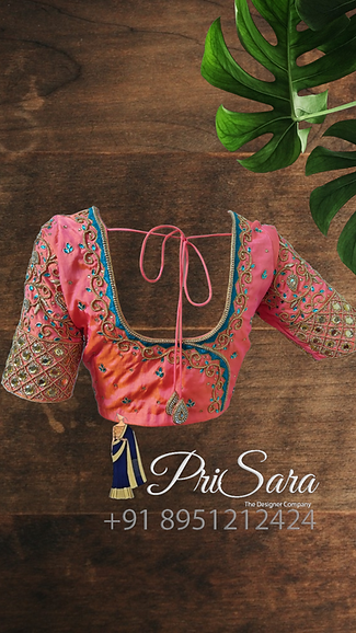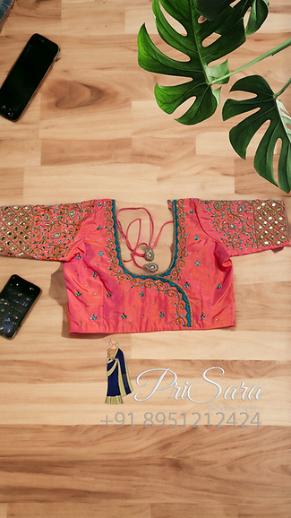 The blouse is dark peach color, has contrasting thread work, fully stitched. A uniform zardozi embroidery design is been done all over the blouse, there are beads work done which compliments and enhance the richness of the blouse. The blouse is styled with a long elbow sleeve that has a checked pattern, with a rich Kodi design stitched at the border of the sleeve.