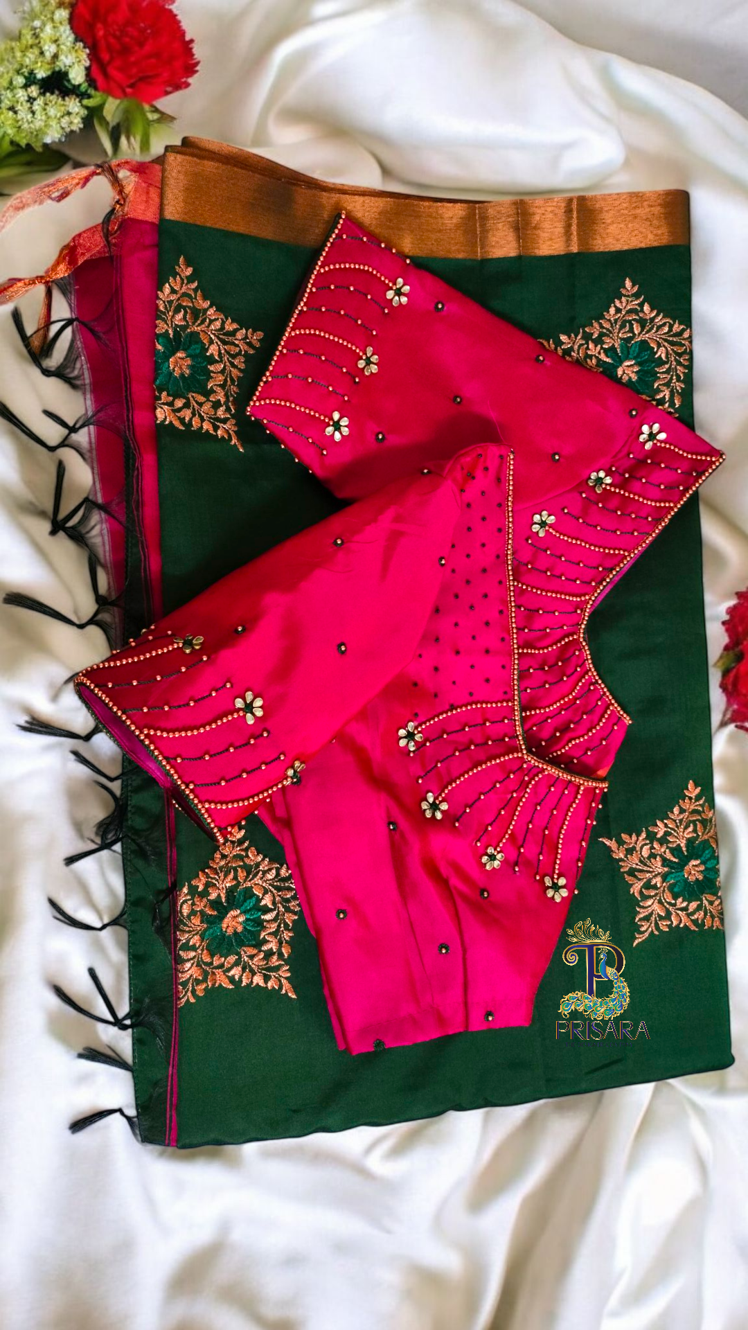 ✔️ Intricate Green Thread Work – Perfectly complementing the saree’s color combination. ✔️ Floral Kundan Stone Embellishments – Adding a touch of sophistication and sparkle. ✔️ Copper Beads & Matching Border – Elevating the overall richness and blending seamlessly with the saree. ✔️ Elegant & Budget-Friendly Design – A luxurious look without a hefty price tag.