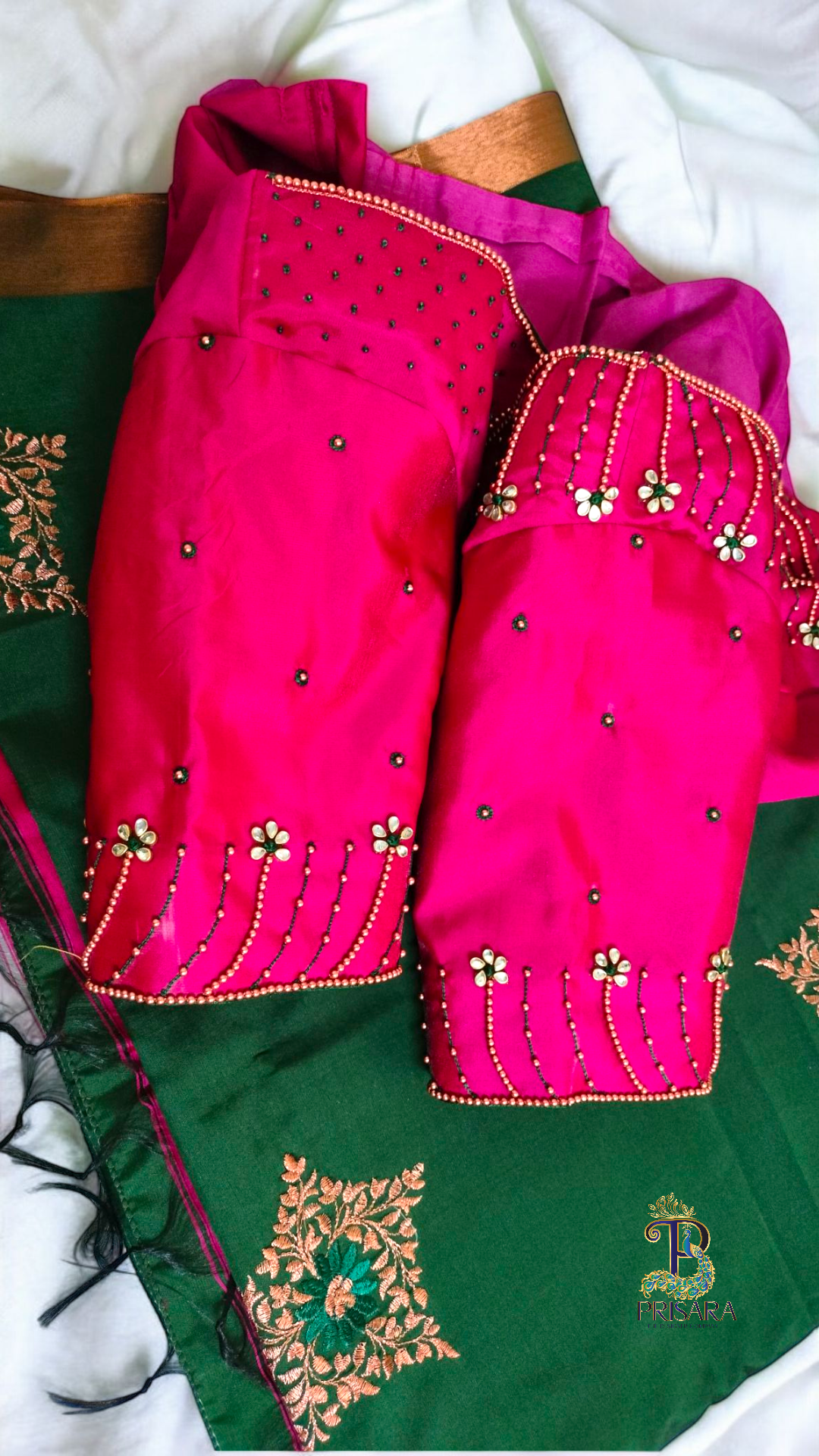 A beautifully handcrafted Aari/Maggam work blouse featuring intricate thread work, beads, and kundan stone embellishments. Designed to be elegant yet affordable, making it perfect for festive and special occasions.