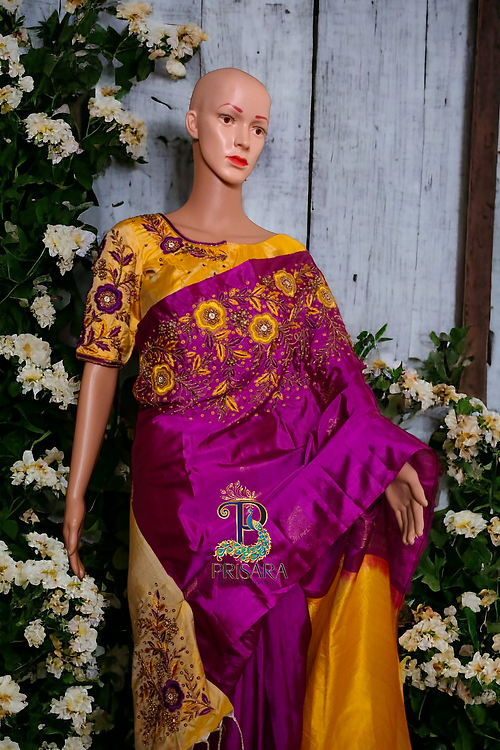 Embroidery: Heavy, intricate, and detailed on pallu, chest, and blouse
