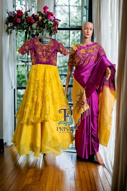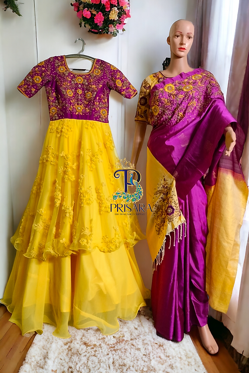 Elegant Mom and Daughter Combo: Pure Soft Silk Saree with Designer Double-Layered Gown