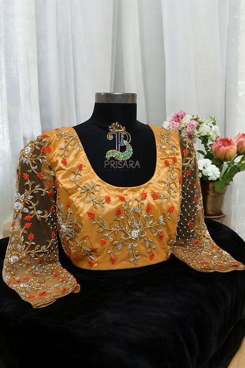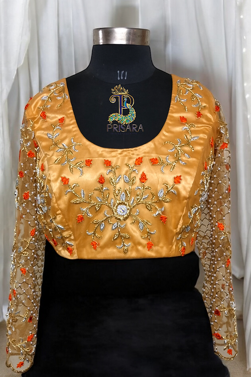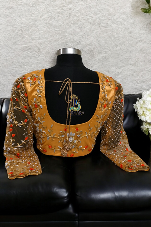 Introducing our exquisitely designed 2-in-1 bridal blouse, crafted to add timeless elegance to your wardrobe. This gold net embroidery blouse is adorned with intricate silver and gold Zardosi work, complemented by vibrant orange French knot thread detailing, making it a masterpiece for special occasions.