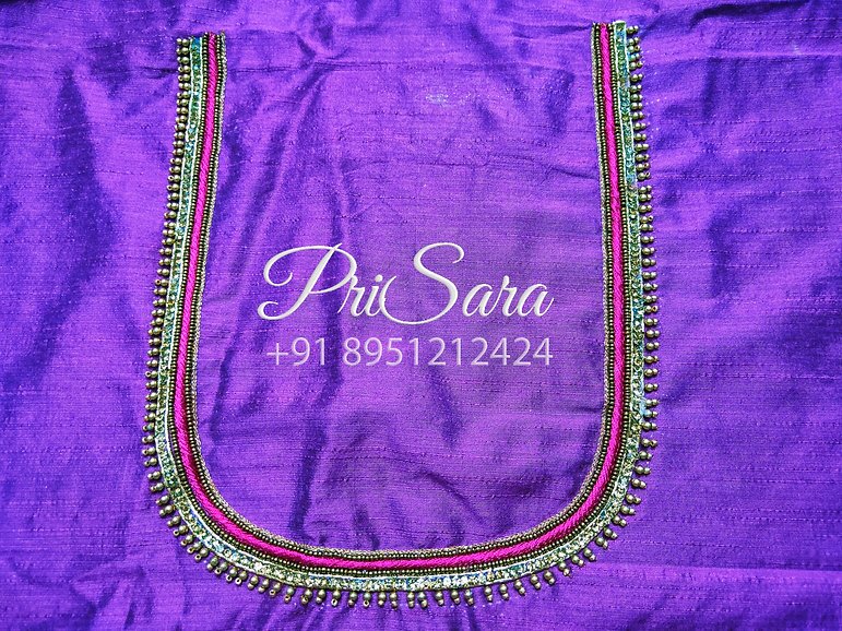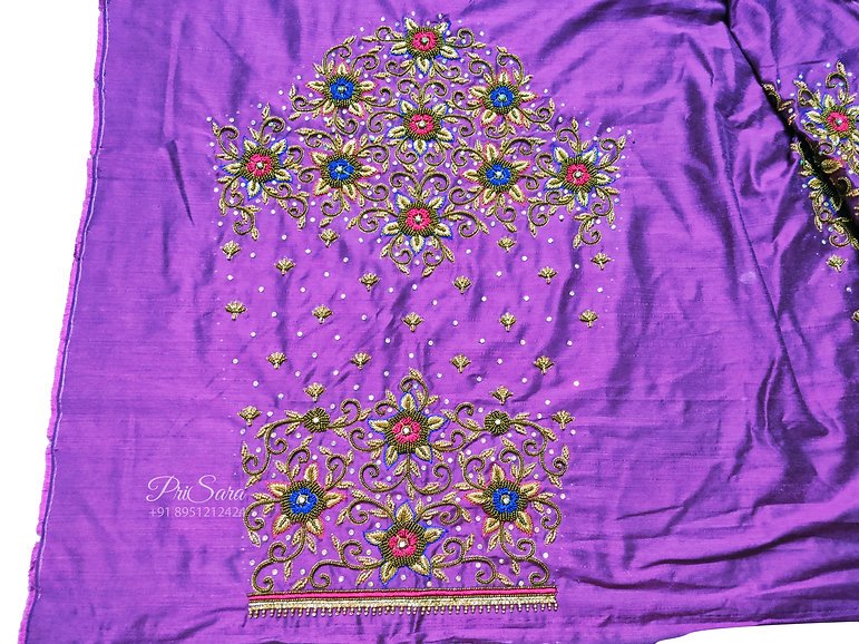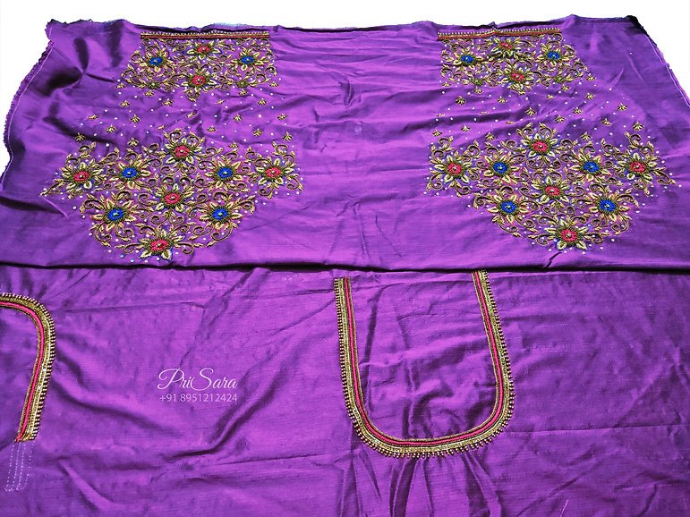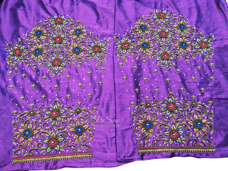 This is a full sleeves bridal blouse with heavy antique beads and zardosi work. Its designed on a unique and beautiful color. Any size and color can be customised. For more details whatsapp +91 8951212424.