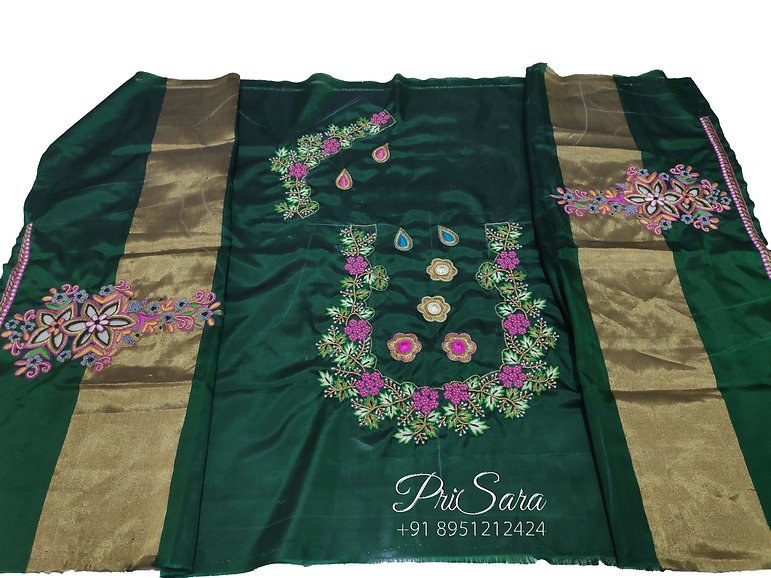 This is a Green colored, unstitched blouse piece. It has a heavily embroidered flower pattern design, with thread work and beadwork done in contrast with the flower design