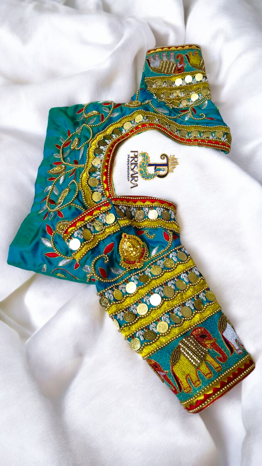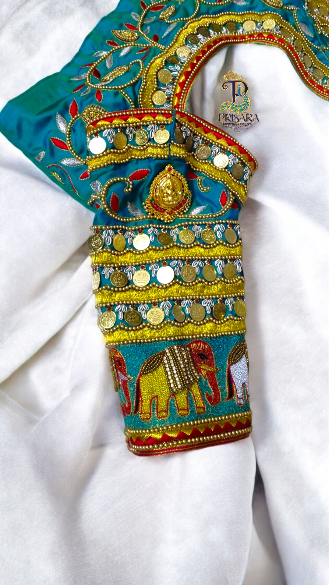 The sleeve length is elbow, and it begins with a prominent Lakshmi pendant, representing divine grace and blessings. Three layers of Lakshmi coin work follow the pendant, symbolizing prosperity and fortune. The top layer is further enhanced with an elephant border design, which is a traditional symbol of strength and auspiciousness.