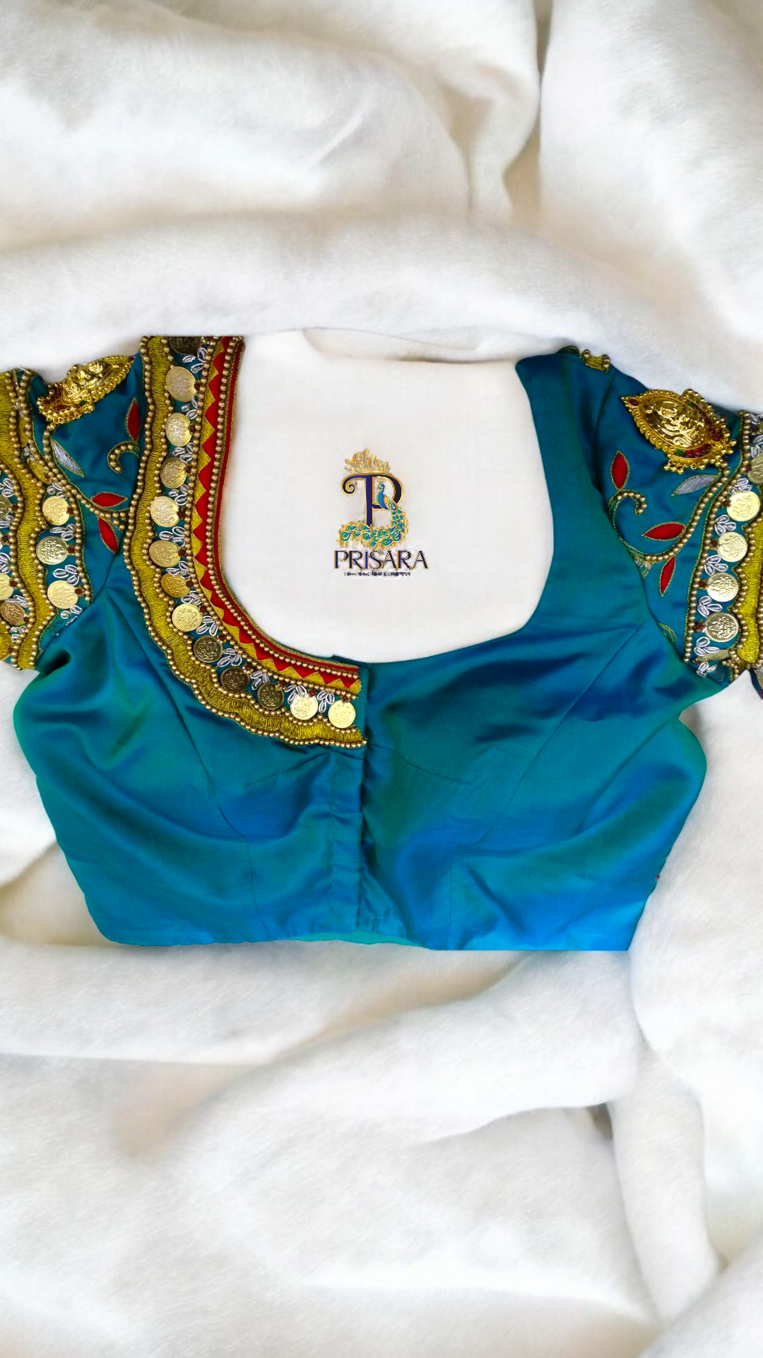 The back neck of the blouse is adorned with a beautiful border of heavy coin work, symbolizing wealth and abundance. The intricate craftsmanship captures the essence of traditional jewelry, elevating the blouse to a regal and opulent level.