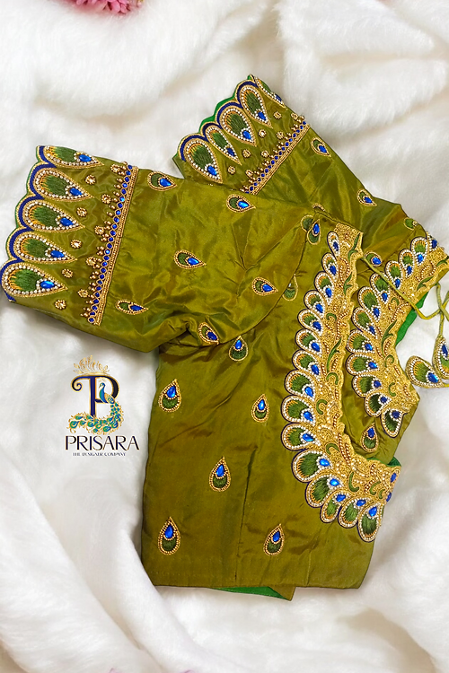 Mustard Green Bridal Blouse with Peacock Feather Concept