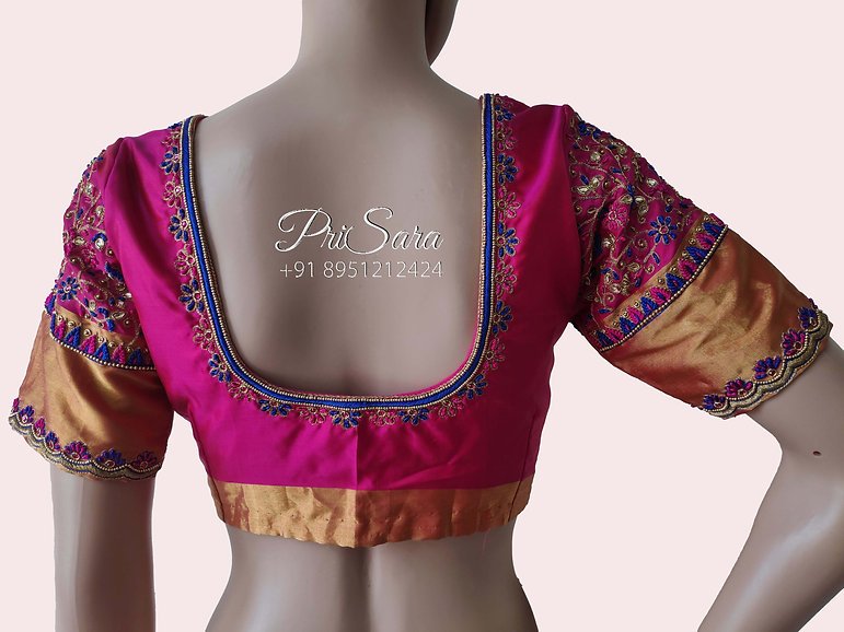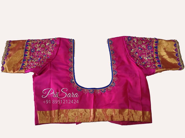 This is a pink blouse, fully stitched. It has Kodi embroidery done on the neck and the sleeves of the blouse with threadworks