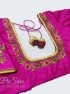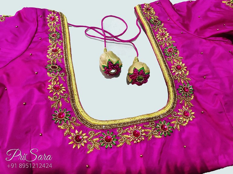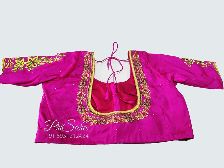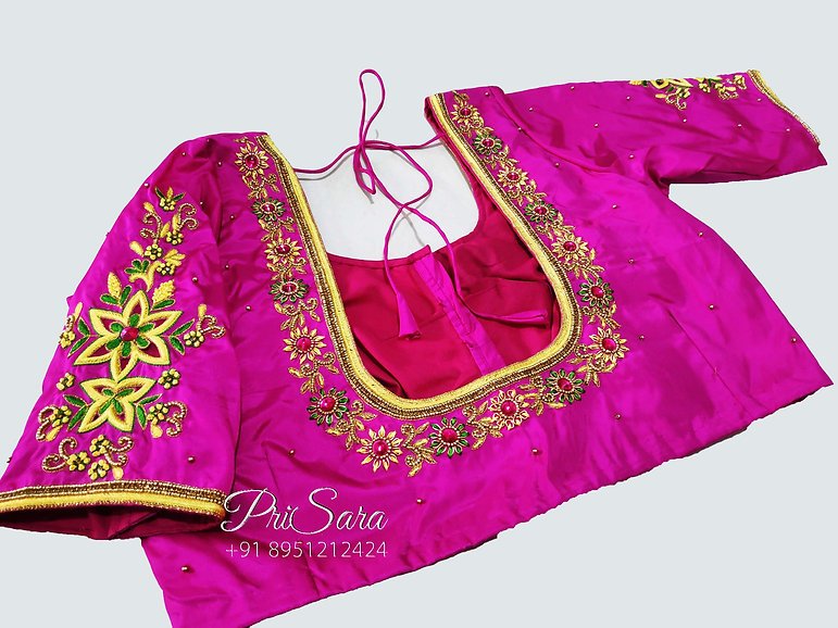Simple embroidery is done all over the blouse which fills in the theme of flowers. The same design can be seen on each sleeve. The sleeve is elbow length. The bead stitching is done to give it a more realistic feel, which can be seen in the blouse. The sewing of small beads has given more detail to the blouse. The use of contrasting colors is the reason which is giving this clear view of the blouse designs. The size, color, and material can be customized as per your need and interest.