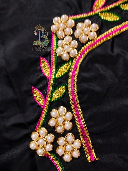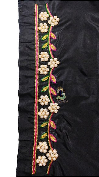 PRISARA-Black Aari/Maggam Embroidery with Floral Design with Pearl Beads, Zardosi and Thread Work on Semi Pattu Silk Fabric Unstitched-One Meter.
