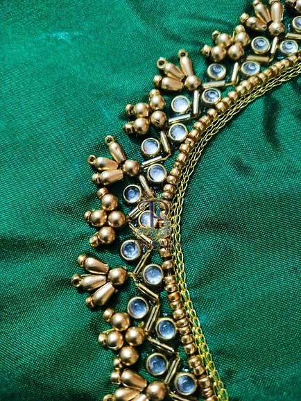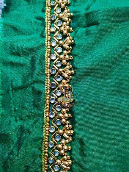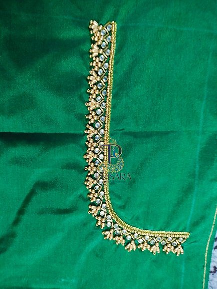 Fabric: Unstitched semi-pattu silk fabric for blouse with green colour and heavy beads and kundan stones work. Embroidery: Exquisite aari/maggam embroidery adorns the fabric, adding an elegant touch. Length: One metre of fabric, providing ample material for a stylish blouse. Occasion: Suitable for festive occasions, weddings, or formal events where you want to make a statement. Care: Follow recommended care instructions to maintain the fabric’s lustre and embroidery’s vibrancy.
