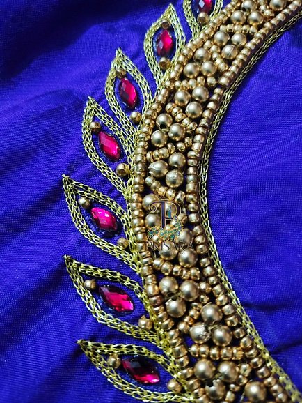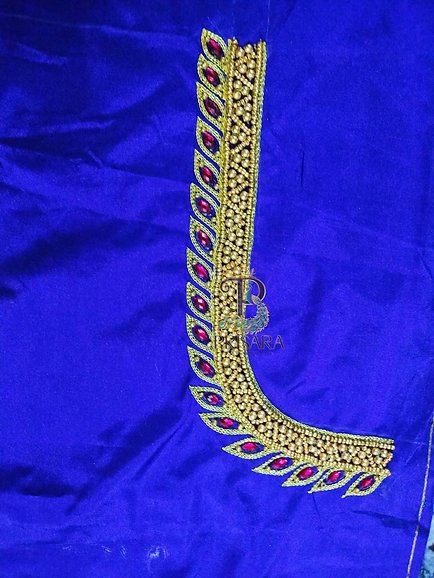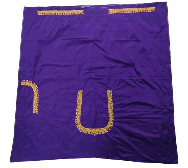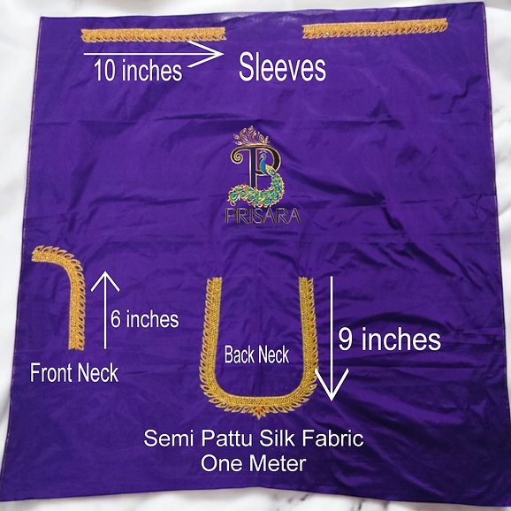 Elevate your ethnic ensemble with this exquisite violet blouse crafted from semi pattu silk fabric. Adorned with intricate aari/maggam embroidery, this unstitched blouse of one metre length features delicate kundan stones and heavy bead work that add an opulent touch. The rich purple hue and ornate embellishments make it a captivating choice for festive occasions or traditional events. Pair it with complementary ethnic attire to create a stunning, eye-catching look. Please note that this product requires delicate care and hand washing is recommended.
