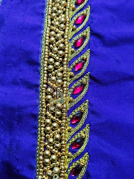 Exquisite Design: This violet blouse features intricate Aari/Maggam embroidery with pink Kundan stones and heavy beadwork on semi pattu silk fabric.