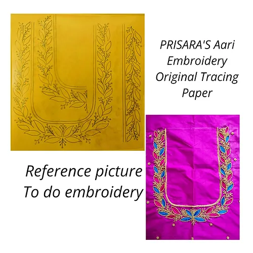 Simple aari embroidey design tracing paper. These papers are waterproof and non tareable. The design covers back neck of around 9 inch and front neck of around 6 inch and sleeves around 10 inch. You can adjust the measurements as per your requirements. For any queries contact +91 8951212424.