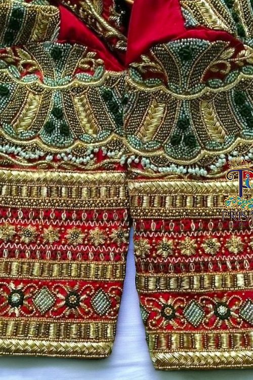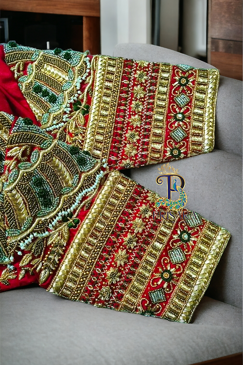 Our blouses are not mass-produced—they are individually hand-made using the highest quality materials to ensure an exquisite finish. This design is a trending favorite among brides and is especially suited for golden sarees with red borders.