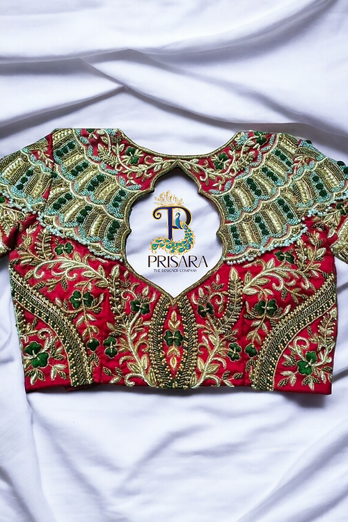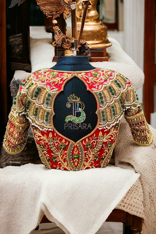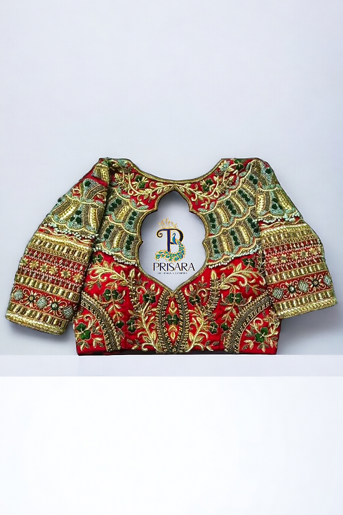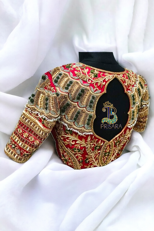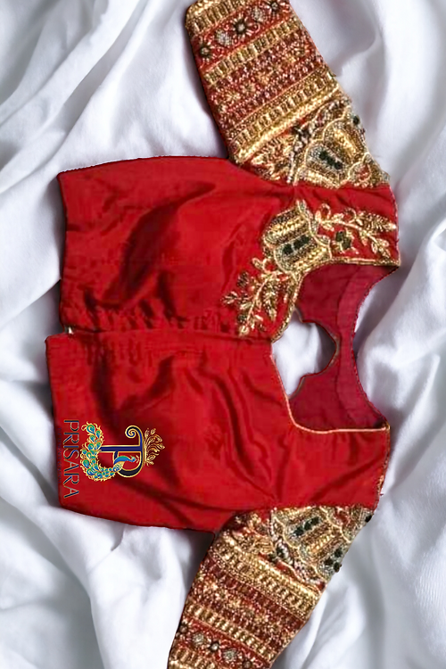 This breathtaking bridal blouse is a one-of-a-kind masterpiece, showcasing the beauty of traditional craftsmanship and premium design. The blouse features: