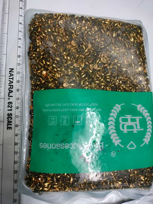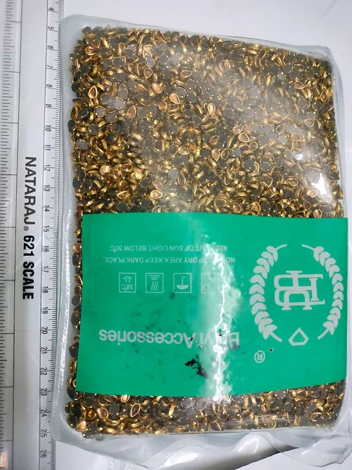 Thilagam shape gold Kundan stones with gold borders. Used for aari embroidery. High quality stones. Size of the stone is 4*6mm. Price is mentioned for 10grams.