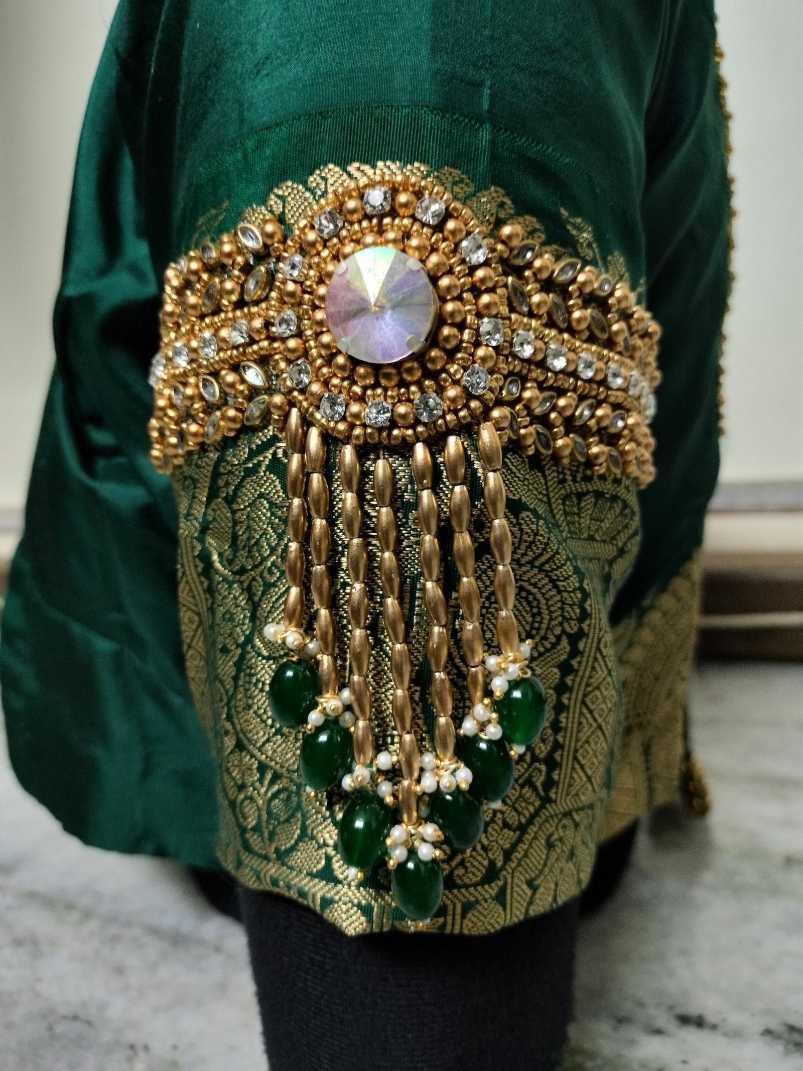 Uncategorized Vanki Style Bridal Blouse Design – Royal, Elegant & New-Age By Prisara@321123 0 Comments Posted on April 17, 2025 Vanki (armlet) patterns are deeply rooted in South Indian bridal culture, symbolizing strength, elegance, and tradition. At PRISARA, we’ve transformed this traditional Vanki design into a breathtaking bridal blouse that’s perfect for the modern bride who wants a hint of classic heritage in her outfit. Design Highlights The back neck is simple yet elegant, adorned with gold fitting Kundan stones and bead work, bringing subtle sparkle and structure. The sleeves are designed in a Vanki pattern, a true standout feature crafted using clip stones and intricate bead work. Hanging beads add flow, richness, and movement — enhancing the overall bridal look beautifully. This blouse design is a fresh and elegant take on bridal fashion, offering a blend of traditional motifs and contemporary styling. Why You’ll Love It A statement bridal blouse that balances modern elegance and cultural symbolism Ideal for silk sarees, traditional Kanjivarams, or even modern designer drapes Sleeves double as jewellery with the Vanki look Lightweight yet royal appeal Customization & Orders Looking to customise yours directly from the manufacturer at wholesale prices?Call 8951212424 and bring your dream blouse to life. Want to master this embroidery style?Join our Aari/Maggam Embroidery Classes, both online & offline. Visit www.prisara.com today #VankiBlouseDesign #BridalBlouseDesign #KundanStonesBlouse #BeadsWorkBlouse #ClipStonesWork #ElegantBridalLook #HangingBeadsBlouse #TraditionalBlouseDesign #SouthIndianBrideLook #CustomBlouseDesigns #AariWork #MaggamWork #PrisaraDesigns #VankiPatternSleeves #WeddingBlouseInspo #HandEmbroideredBlouse #WholesaleBlouseDesigns #LearnEmbroidery #BangaloreBoutique Share: